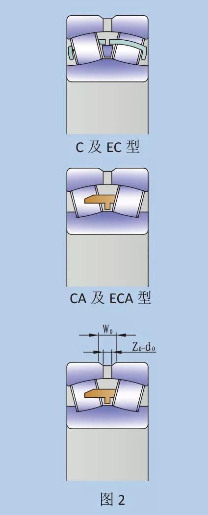 為了便于有效潤滑,標準型 HRB 調(diào)心滾子軸承外圈帶有環(huán)狀油槽和三個油孔,但外徑小于 150mm 或 180mm(隨不同系列而定)之 C 型軸承及所有 213 系列軸承除外。后綴W33 用于表示 C、EC、CA 及 ECA 型軸承外圈帶有油槽及油孔。