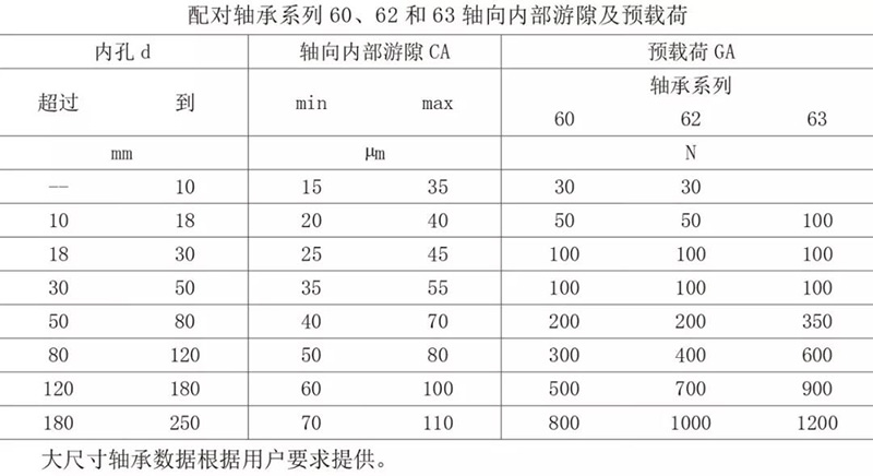 配對(duì)軸承的游隙和預(yù)壓見下表: